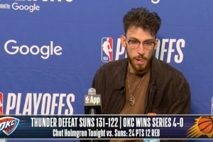 体育资讯4月28日讯 NBA季后赛首轮G4,雷霆131-122胜太阳,大比分4-0晋级。赛后雷霆球星霍姆格伦接受了媒体采访,以下为完整版采访内容。