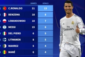 关于欧冠改制后半决赛进球榜:C罗13球居首,本泽马、莱万、梅西在列,当前阶段的情况已基本明朗。