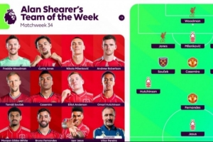 体育资讯4月28日讯 英超第34轮战罢,阿兰·希勒评选了本轮最佳阵容,卡塞米罗、B费在列,诺丁汉森林5人入选。
