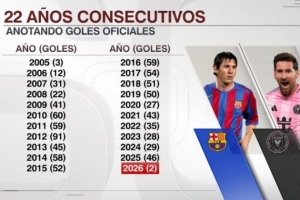 梅西已经连续22个自然年破门,以下为他在这22年进球数分布: