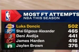 随着相关信息不断披露,东契奇本赛季罚球超500个联盟首人 亚历山大465个排第二&哈登第四的情况逐渐清晰。