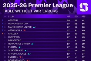 体育资讯3月3日讯 Squawka列出了VAR没有犯错的情况下,目前英超的积分排名,阿森纳61分居首,曼城、曼联二三位。