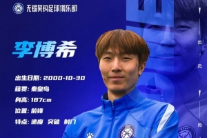 姓名:李博希(回归),籍贯:河北秦皇岛,出生日期:2000年10月30日,身高:187cm,位置:前锋,惯用脚:右脚。
