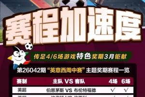 第26042期传足4/6场游戏特色奖期已经于2026年3月1日20:00开售,将于2026年3月3日22:00停售,并于2026年3月4日开奖,其中伯恩茅斯VS布伦特福德、埃弗顿VS伯恩利、利兹联VS桑德兰、狼队VS利物浦为4场进球游戏竞猜赛事。