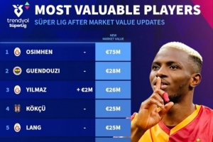 体育资讯3月6日讯 德国转会市场公布了新一期的土超球员身价情况,奥斯梅恩以7500万欧高居榜首,贡多齐以2800万欧元位居次席。